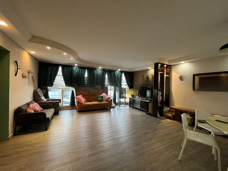 Step into a warm and inviting atmosphere in this well-maintained 5-room point block end unit. The open-concept living and dining area is bathed in natural light, enhanced by a stylish false ceiling with cove lighting and elegant wood-look flooring. Large windows frame the views, creating a cozy space perfect for relaxation and entertaining.
