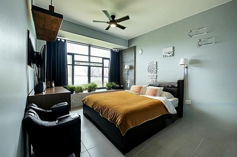 This thoughtfully designed unit boasts an efficient layout with three spacious bedrooms, including a master suite with an en-suite bathroom. The living area features a stylish patterned wall and ceiling fans with integrated lighting for comfort. The dining area impresses with mirrored wall panels and modern pendant lighting, enhancing the overall aesthetic. A dedicated service yard off the kitchen adds practicality to this charming home.