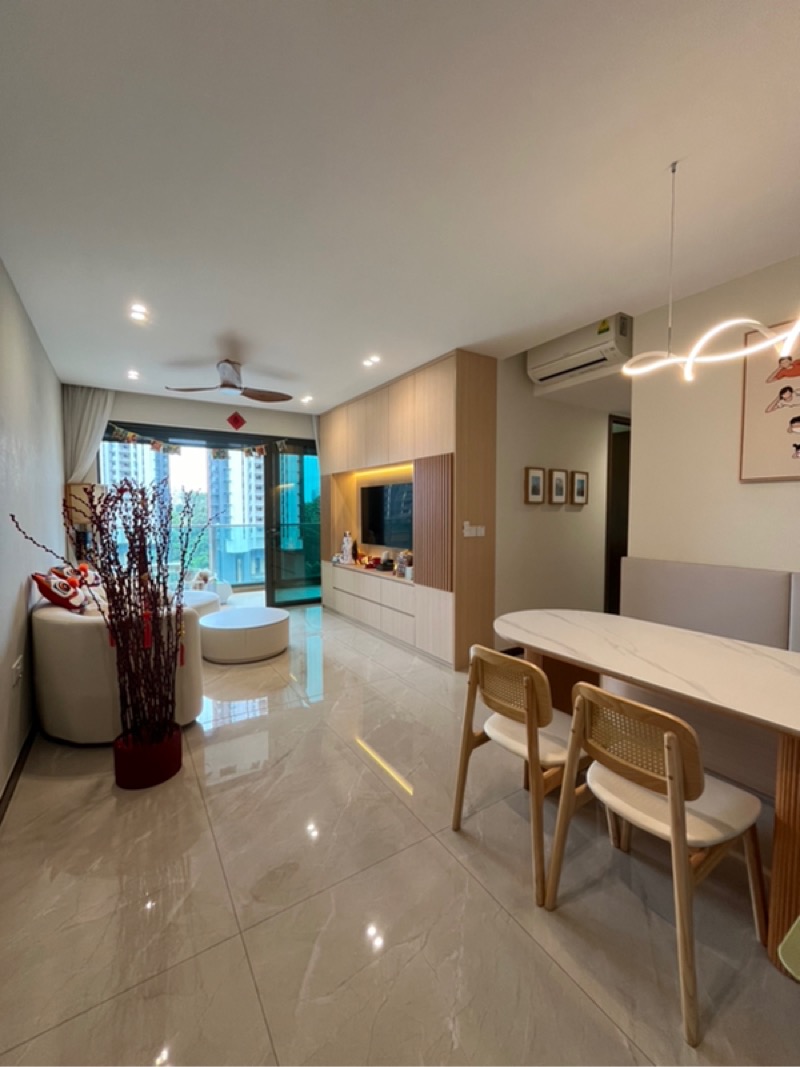 Step into this beautifully renovated 2-bedroom unit at Normanton Park, where abundant natural light floods the open-concept living and dining area. The polished tile flooring and elegant pendant lighting create a bright and airy ambiance, while the balcony offers a serene view of the lap pool and lush greenery, complemented by the city skyline in the distance.