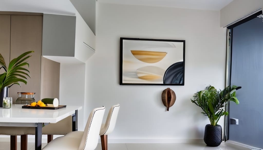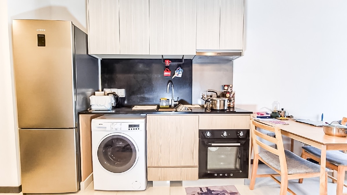 This well-maintained unit features an efficient layout with a stylish kitchen equipped with integrated appliances and a chic black tiled backsplash. The master bedroom boasts a cozy ambiance with a ceiling fan, large window, and an upholstered headboard, ensuring comfort and relaxation. The outdoor common area is perfect for entertaining, featuring a black granite BBQ counter and a geometric glass pergola, all set amidst tropical landscaping.