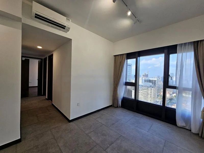 Step into this modern minimalist sanctuary at Midtown Modern, where abundant natural light floods the spacious living area through floor-to-ceiling windows, offering breathtaking views of the city skyline and Raffles Hospital. The sleek finishes, including large format grey floor tiles and track lighting, create an inviting ambiance that is both stylish and functional.