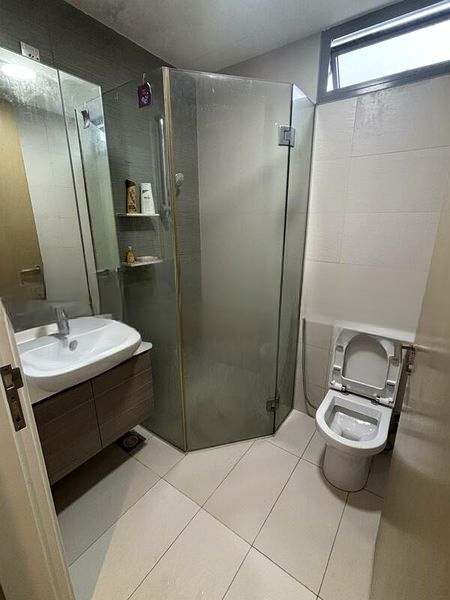 This well-maintained 1-bedroom unit features a narrow galley kitchen equipped with integrated appliances, complemented by white countertops and dark cabinetry. The bathroom boasts a pentagonal glass shower enclosure and a rain shower head, while the living room flows seamlessly into the balcony, perfect for relaxation or entertaining. The thoughtful layout transitions from stone to wood flooring, enhancing the modern aesthetic throughout.