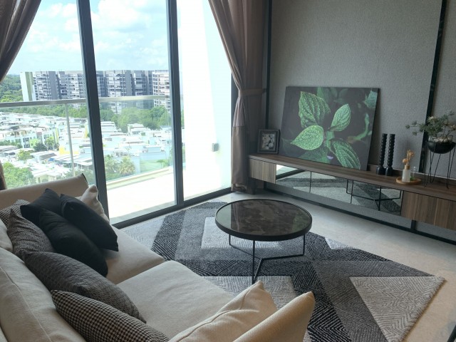 Step into a sanctuary of modern minimalism where abundant natural light floods the living space, highlighting the polished stone flooring and sleek finishes. The floor-to-ceiling sliding glass doors invite you to the large balcony, offering unobstructed views of lush greenery and the surrounding HDB blocks, creating a serene atmosphere that feels both spacious and inviting.