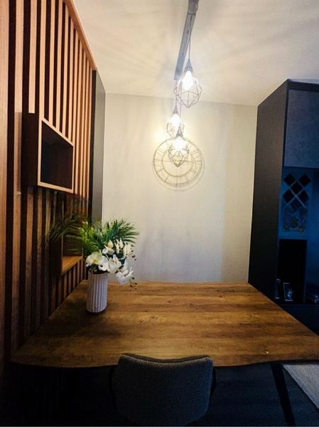 Step into a world of contemporary elegance where abundant natural light floods the space, highlighting the designer finishes that define this well-maintained unit. The modern minimalist ambiance is accentuated by the slatted wood feature wall and track lighting, creating a warm and inviting atmosphere. Enjoy serene views of neighboring residential buildings from your large balcony, complete with wood decking, artificial turf, and a lush green wall.