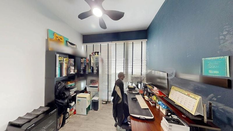 This well-maintained 3-bedroom unit boasts standout features including a large outdoor terrace with wood decking, perfect for alfresco dining or lounging under the retractable roof. The spiral staircase adds a unique architectural touch, leading you to a cozy balcony area. Each room is thoughtfully designed, with the master bedroom offering large windows for breathtaking views, while the study provides a tranquil workspace with a dark blue accent wall and ample shelving.