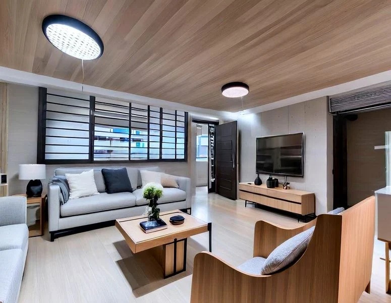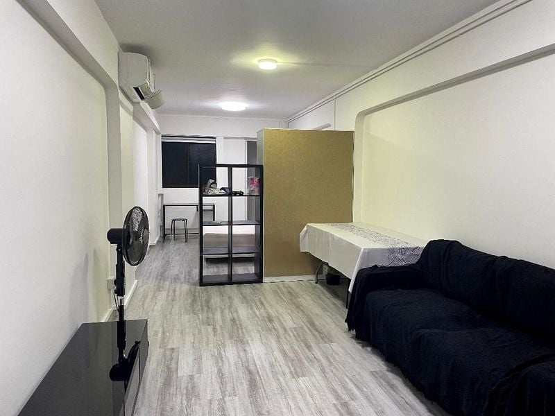 Step into a beautifully maintained studio unit that exudes modern minimalist charm. The open-plan layout welcomes you with wood-look vinyl flooring and a dedicated workspace, bathed in moderate natural light. The ambiance is inviting, complemented by a black fabric sofa that adds a touch of elegance to the living area.