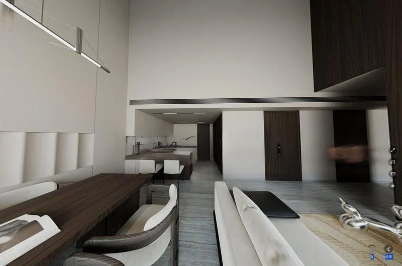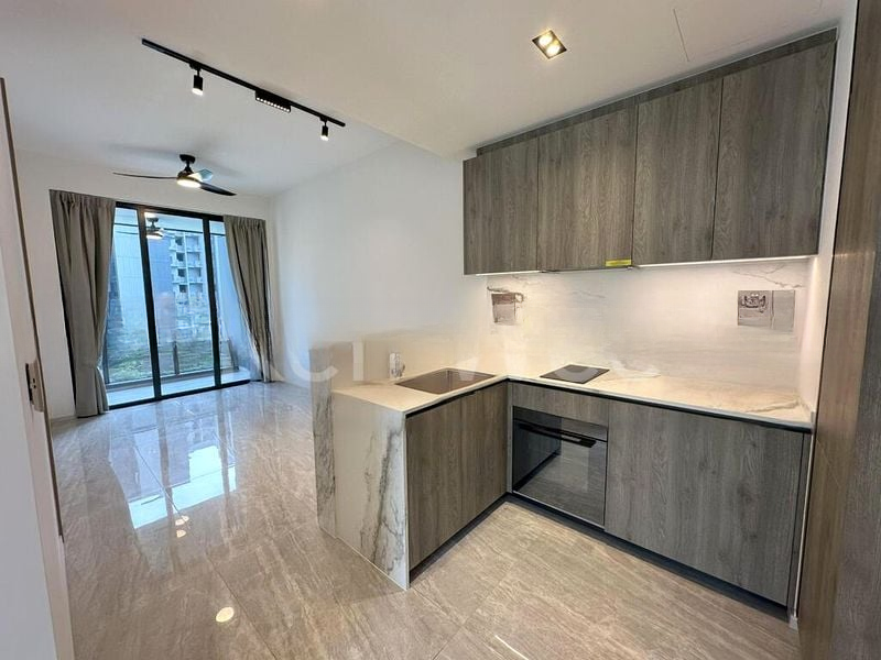 This thoughtfully designed unit features a modern kitchen with wood-grain cabinetry, an integrated oven, and a chic marble-look countertop, perfect for culinary enthusiasts. The master bedroom boasts floor-to-ceiling windows and an en-suite bathroom, while the second bedroom and study offer versatility and comfort. Built-in sliding wardrobes provide ample storage, ensuring a clutter-free living environment.