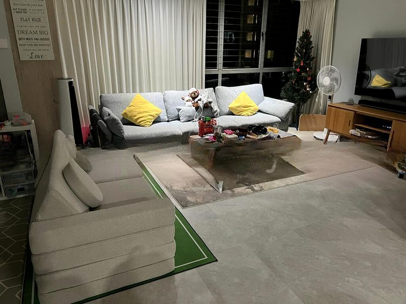 Step into a bright and airy sanctuary where abundant natural light floods the space, accentuating the polished stone flooring and elegant wooden furnishings. The high-floor unit offers unblocked views of lush greenery and surrounding residential buildings, creating a serene ambiance that invites relaxation and comfort.