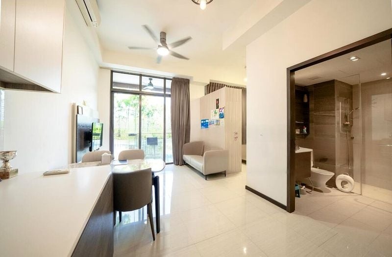 Step into a world of light and tranquility in this beautifully maintained 2-bedroom unit at Sims Urban Oasis. The abundant natural light floods through the floor-to-ceiling windows, creating an inviting and airy ambiance. Enjoy serene views of the lush greenery and the large lap pool from your private balcony, making every moment spent here feel like a retreat.