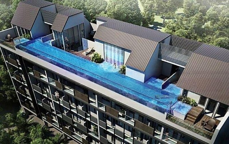 This thoughtfully designed 2-bedroom, 2-bathroom condo features a compact layout that maximizes space and functionality. Enjoy the luxury of a home gym with panoramic views, a modern bathroom with a vessel sink, and floor-to-ceiling mirrored wardrobes that add a touch of sophistication. The infinity-style pool area, adorned with blue mosaic tiles and glass safety railings, offers an ideal setting for relaxation and entertainment.