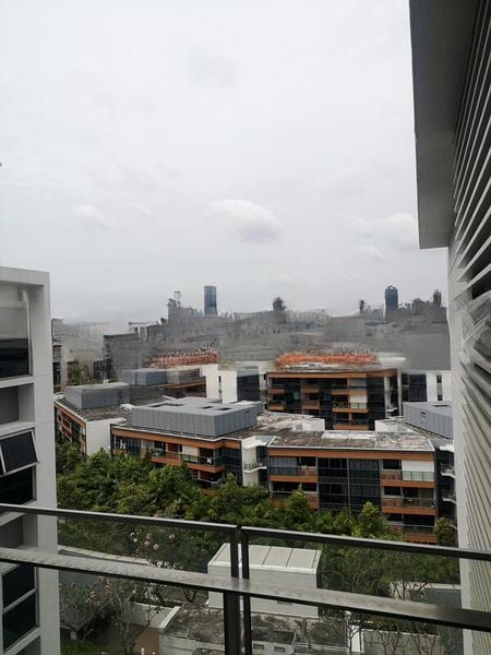 Step into a bright and airy sanctuary at Sophia Residence, where abundant natural light floods the living spaces, highlighting the elegant wooden flooring and modern finishes. The expansive balcony, adorned with wooden decking, offers a serene view of lush greenery and neighboring buildings, creating a perfect retreat for relaxation or entertaining.