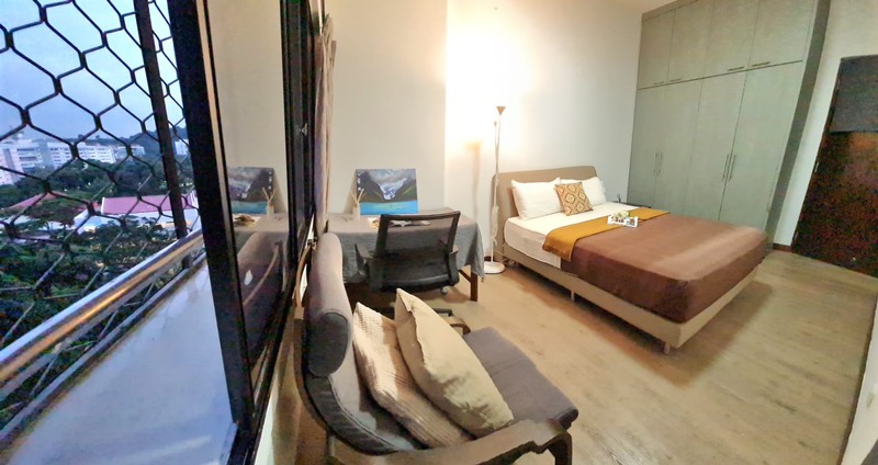 This well-maintained unit features elegant parquet flooring throughout, complemented by built-in wardrobes and a dedicated study desk area in the bedroom. The bathroom is a perfect blend of functionality and comfort, featuring a bathtub and a large vanity mirror, making it an ideal space for relaxation after a long day.