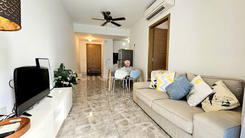Step into a world of elegance as you enter this bright and airy unit at The Santorini. The marble-look floor tiles reflect abundant natural light, creating a warm and inviting atmosphere. Enjoy breathtaking views of the lap pool and lush greenery from your living room and balcony, enhanced by invisible grilles that maintain the open feel.