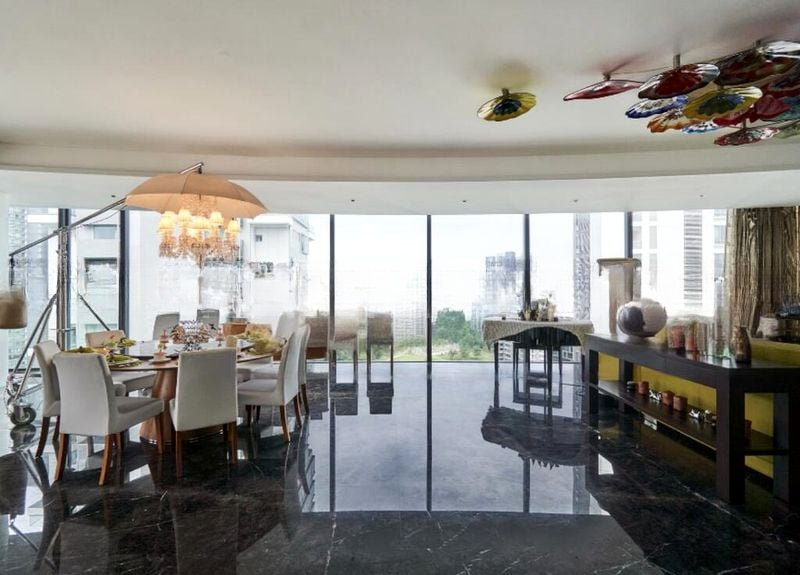 This well-maintained 4-bedroom, 5-bathroom condominium boasts an open-concept living area that flows effortlessly into a dining space featuring a large round table and balcony access. The master suite is a sanctuary with wood flooring, a built-in window seat, and cove lighting, while the luxurious bathroom showcases a freestanding stone-textured bathtub against a backdrop of black marble walls. Every detail has been thoughtfully curated to enhance your living experience.