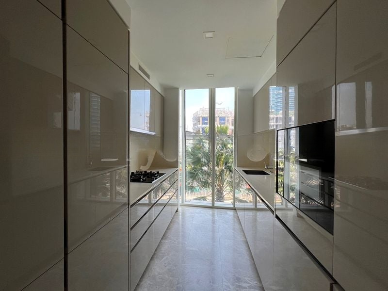 This well-maintained unit features two spacious bedrooms, including a master suite with an en-suite bathroom and floor-to-ceiling windows that invite the outdoors in. The modern kitchen boasts dark wood cabinetry and integrated appliances, seamlessly blending style and functionality. Bathrooms are adorned with travertine-style wall tiles and contemporary fixtures, ensuring a luxurious experience.