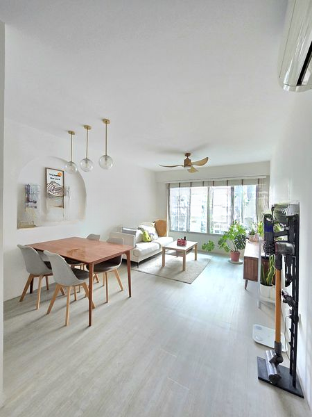 Step into a bright and airy sanctuary at Citigate Residence, where abundant natural light floods the spacious living area through large windows, creating an inviting atmosphere. The modern facade of this low-rise building complements the lush greenery views, making every glance out a refreshing experience.