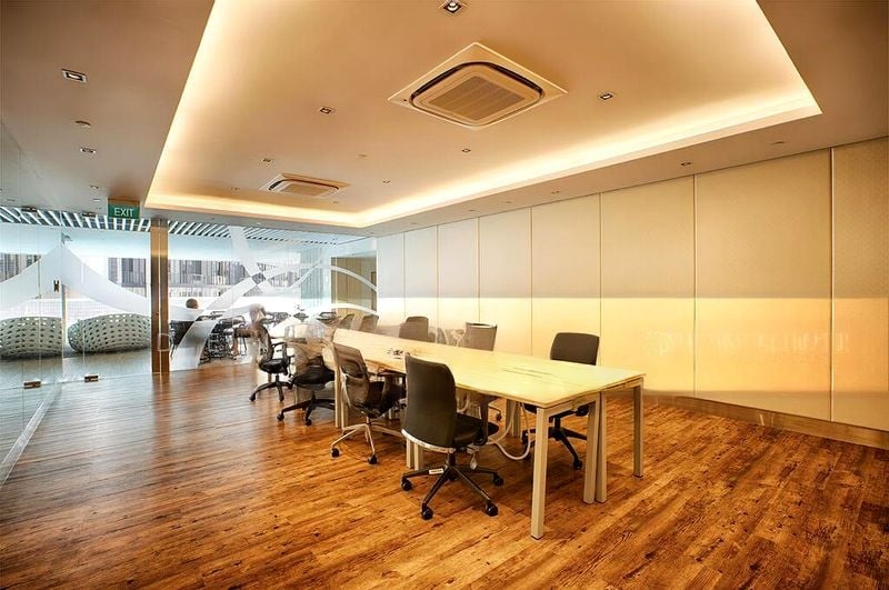 The open floor plan seamlessly connects the living room to a well-appointed kitchen featuring wooden cabinets, grey speckled countertops, and a gas hob, perfect for culinary enthusiasts. The unit also boasts a dedicated study with a built-in wooden desk, a stylish meeting room equipped with ergonomic chairs, and a modern gym with cardio and strength equipment, all designed for contemporary living.