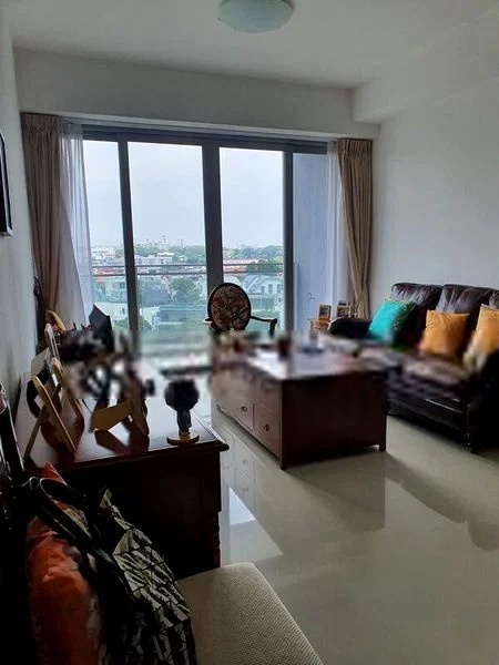 Step into a warm and inviting atmosphere where abundant natural light floods through floor-to-ceiling windows, illuminating the polished tile flooring of the open-concept living area. The cozy ambiance is complemented by a seamless connection to the balcony, offering tranquil views of low-rise residential greenery that invites relaxation and peace.