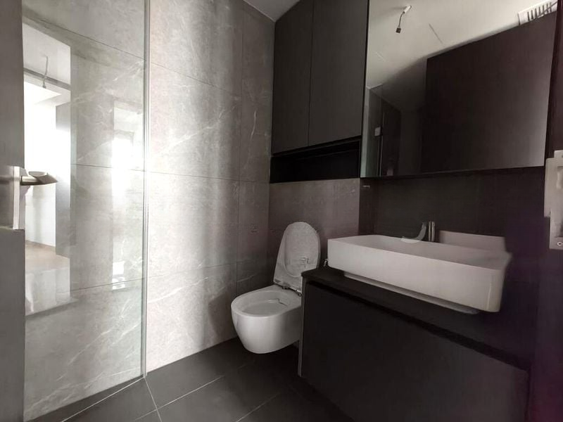 Step into a world of modern elegance as you enter this brand-new unit at Irwell Hill Residences. Bathed in abundant natural light, the airy living space features floor-to-ceiling windows that frame breathtaking views of the city skyline and lush greenery. The sleek finishes, including grey marble-look floor tiles and a striking black marble backsplash, create a sophisticated ambiance that invites relaxation and style.