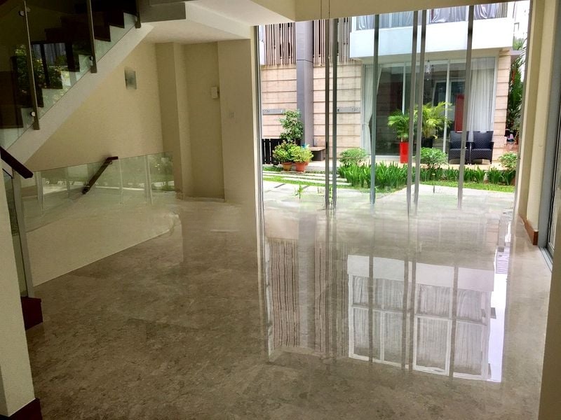 Step into a world of elegance as you enter this well-maintained landed home, where abundant natural light floods the spacious living and dining area through floor-to-ceiling windows. The polished marble flooring enhances the bright and airy ambiance, while the modern pendant lighting adds a touch of sophistication. Enjoy serene views of greenery and neighboring buildings from your private patio, creating a perfect retreat for relaxation.