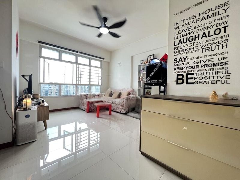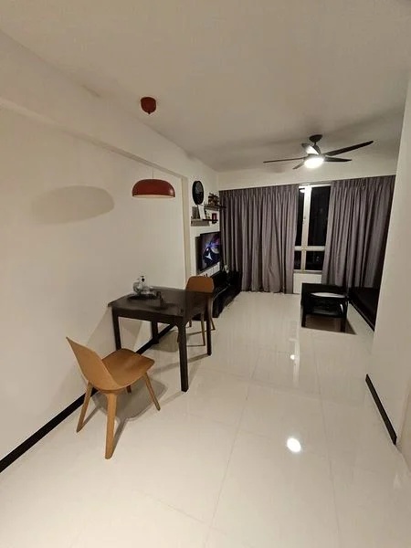 Step into a cozy sanctuary at 363B Sembawang Crescent, where modern finishes meet functional design. The open-concept living area welcomes you with its white tiled flooring, pendant lighting, and wall-mounted shelves, creating a bright and inviting atmosphere. Enjoy the gentle breeze from the ceiling fan as natural light filters through the full-height curtains, enhancing the warm ambiance of this well-maintained unit.