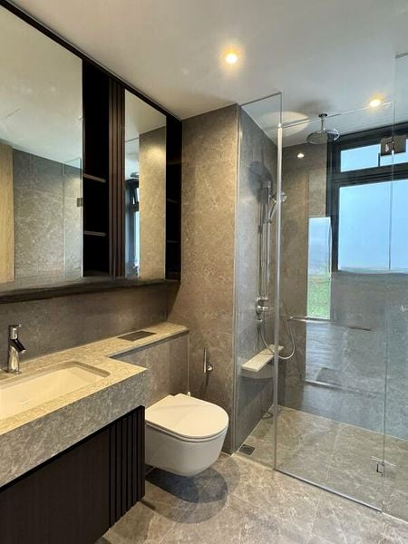 This 2-bedroom, 2-bathroom unit boasts standout features such as floor-to-ceiling built-in wardrobes, a rain shower, and a sleek kitchen equipped with dual-tone cabinetry and an induction hob. The master bedroom is adorned with light wood-look laminate flooring and full-height curtains, while the bathroom showcases elegant grey marble-look tiles and a stylish vessel sink with a wooden vanity. The thoughtful layout ensures both comfort and functionality, making it an ideal home for modern living.