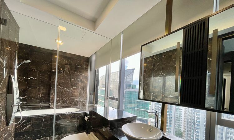 Step into a world of elegance as you enter this well-maintained unit at Helios Residences. The modern minimalist design is accentuated by abundant natural light streaming through expansive floor-to-ceiling windows, offering breathtaking views of the city skyline. The polished dark marble flooring and dark wall paneling create a sophisticated ambiance, while the private lift lobby adds an exclusive touch.