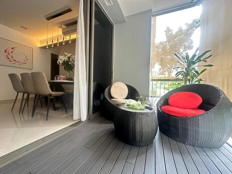 Step into this beautifully renovated 5-bedroom unit at Rivercove Residences, where modern elegance meets cozy living. The open-concept layout invites natural light through large windows, highlighting the stylish finishes and inviting ambiance. Enjoy serene views of lush greenery from your private balcony, complete with wood decking and outdoor seating, perfect for relaxation.