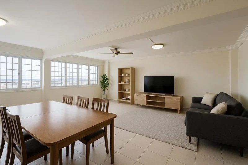 This thoughtfully designed 3-bedroom flat offers a spacious living room with an L-shaped sofa and a dedicated wall-mounted TV area, perfect for family gatherings. Each bedroom boasts parquet wood flooring and built-in storage, ensuring both comfort and practicality. The layout is enhanced by built-in storage units in the hallway, providing ample space for your belongings while maintaining a clean aesthetic.