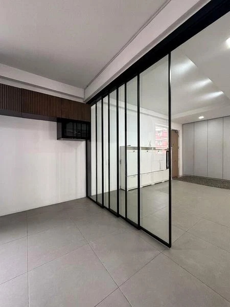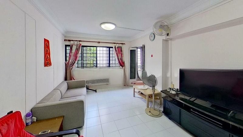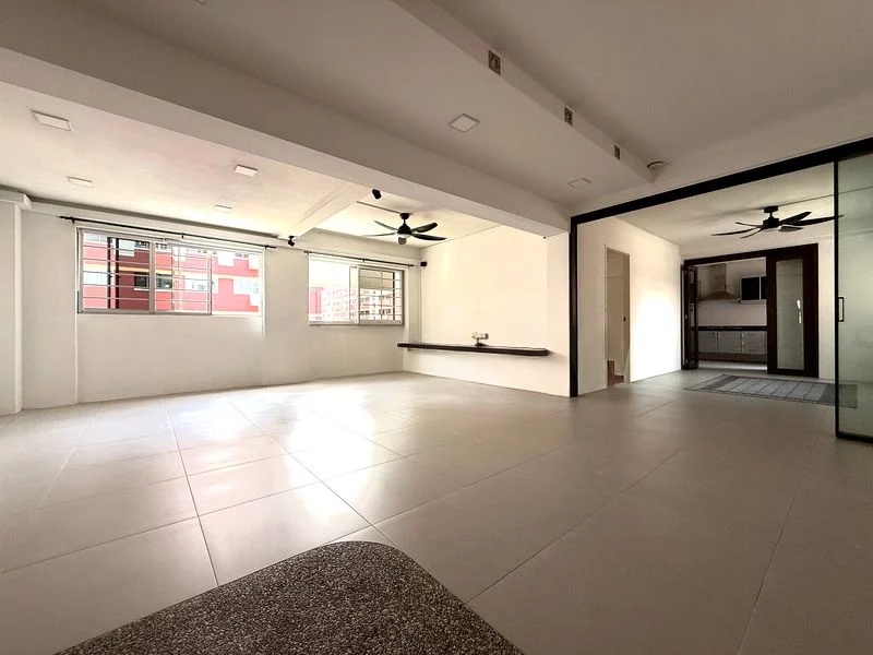 Step into a bright and airy sanctuary at 445 Sin Ming Ave, where abundant natural light floods the spacious open-concept living area. The modern finishes, including grey floor tiles and recessed ceiling lights, create an inviting ambiance, while large windows offer an urban HDB view that enhances the living experience.