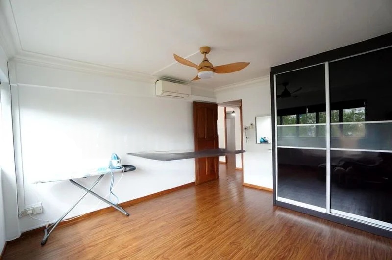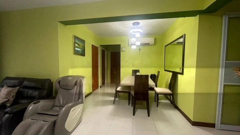 Step into a beautifully renovated 5-room flat that exudes modern minimalist charm. The open-concept living and dining area welcomes you with its dark wood deck flooring and glass partition walls, allowing natural light to flow seamlessly throughout the space. Enjoy the cozy ambiance created by the stylish modern pendant lighting and the inviting views of the neighborhood.