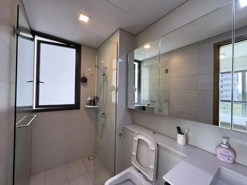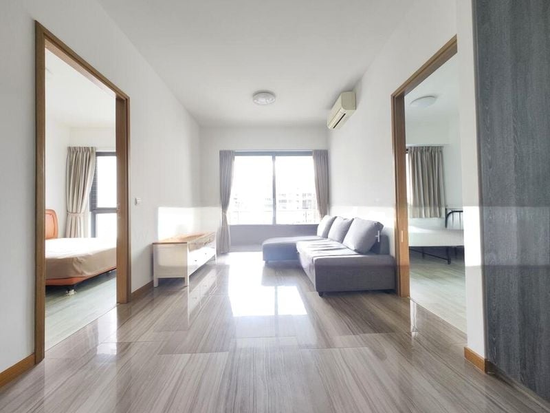 This well-maintained 2-bedroom, 2-bathroom unit features an efficient layout of 764 sq ft, complete with a spacious balcony. The kitchen boasts light-toned cabinetry and a built-in oven, seamlessly integrating with the dining space. The master bedroom offers en-suite access and is adorned with elegant gold-toned curtains, while the second bedroom enjoys similar generous natural light. The bathrooms are thoughtfully designed with wall-hung toilets and mirrored cabinets, enhancing both functionality and style.