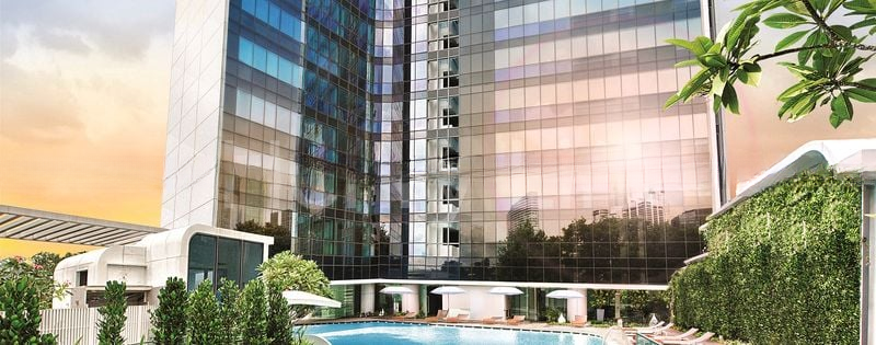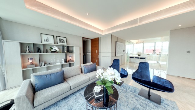 Step into a bright and airy sanctuary at ALBA, where abundant natural light floods through the floor-to-ceiling windows, offering breathtaking views of the city skyline and lush greenery. The elegant wood flooring and cove lighting create a warm ambiance, making this space feel inviting and luxurious from the moment you enter.