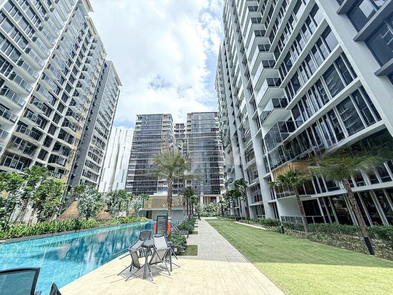 Step into a world of modern elegance as you enter this brand-new 3-bedroom unit at Penrose. Bathed in abundant natural light, the open layout invites you to experience a seamless blend of indoor and outdoor living, with stunning views of the large swimming pool and lush greenery. The minimalist design, accentuated by light wood flooring and tasteful finishes, creates a serene ambiance that feels both inviting and sophisticated.