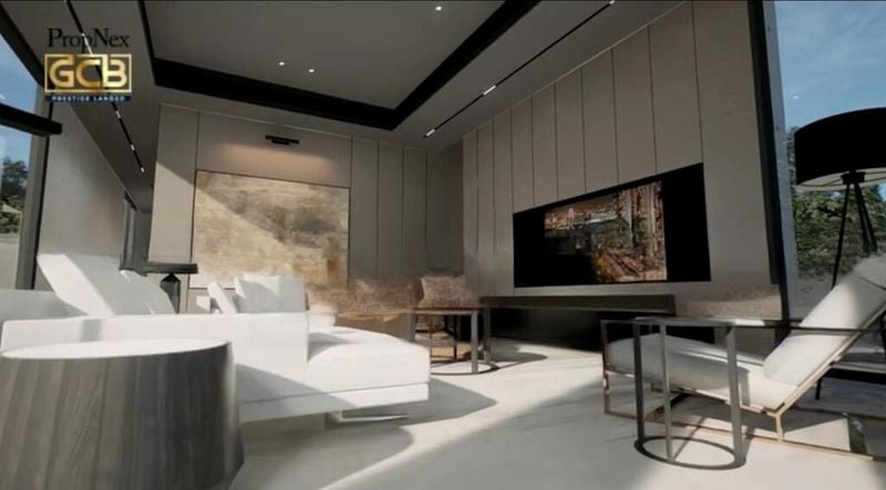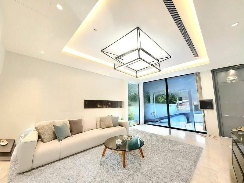 Step into a world of modern luxury as you enter this brand-new designer home, where abundant natural light floods through floor-to-ceiling glass walls, creating an inviting and airy ambiance. The cantilevered architectural design and marble TV feature wall set the tone for sophistication, while the minimalist four-poster bed frame in the bedroom adds a touch of elegance.