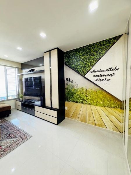 This thoughtfully renovated 4-bedroom unit features an open-concept layout that seamlessly connects the living, dining, and kitchen areas. The modern kitchen is equipped with high-gloss cabinets, black countertops, and a gas hob, making it a chef's delight. Enjoy the convenience of a large TV console with display cabinets in the living room, complemented by stylish ceiling fans that enhance the cozy atmosphere.