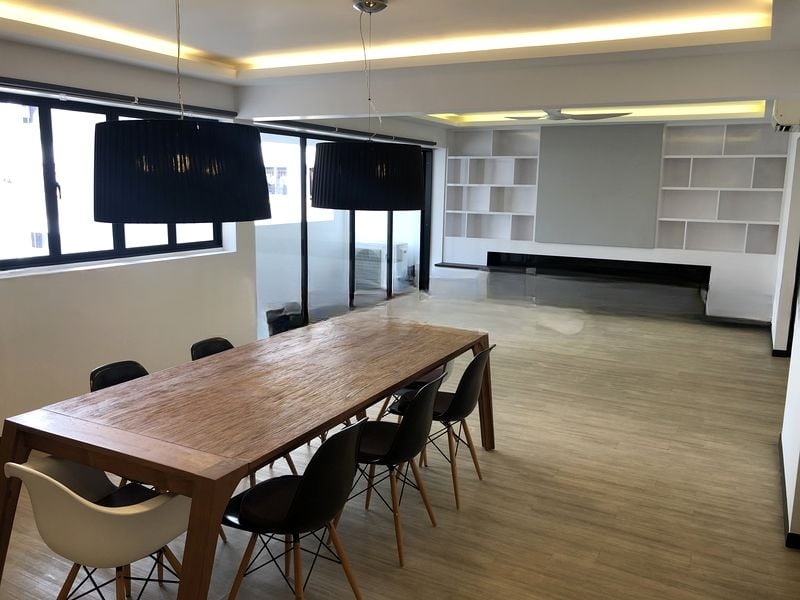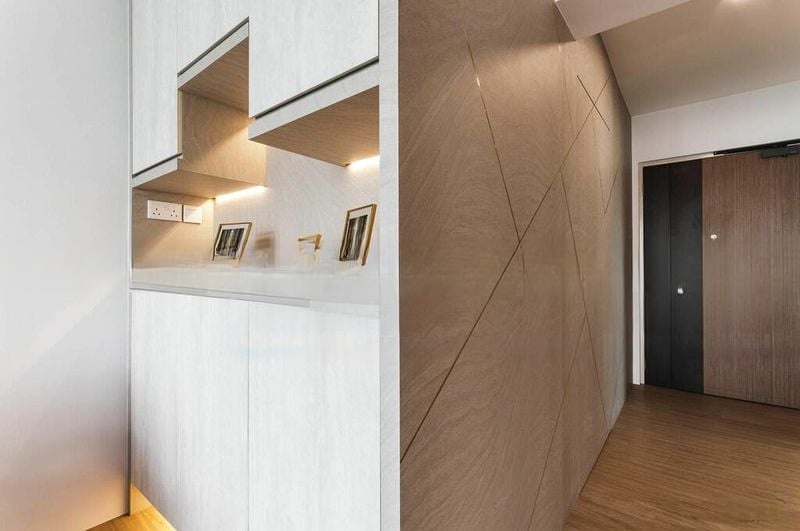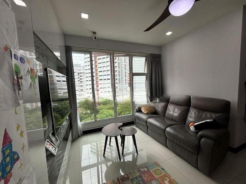 This well-maintained 2-bedroom flat features standout elements such as a galley kitchen with balcony access, perfect for al fresco dining. The living and dining area seamlessly flows together, while the bedrooms boast dark wood-look flooring and integrated study areas. A unique walk-in storage room with floor-to-ceiling metal shelving adds practicality to this stylish home.