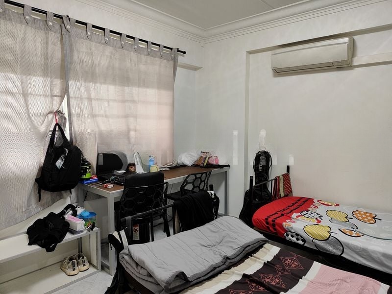 Step into this beautifully renovated HDB flat and be greeted by an abundance of natural light that fills the spacious living and dining area. The polished tile flooring and striking lime green TV feature wall create a vibrant ambiance, while the large windows adorned with full-length curtains offer urban views of the neighboring residential blocks, making this home feel both inviting and expansive.