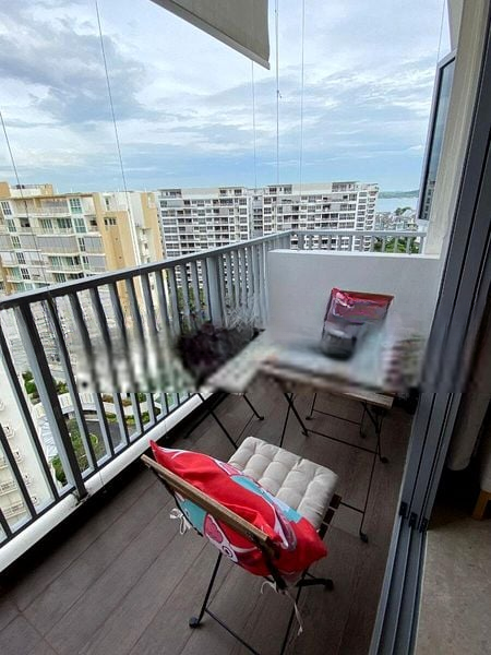 Step into a bright and airy sanctuary at SEASTRAND, where abundant natural light floods the space, accentuating the elegant marble-look flooring throughout the open-concept living and dining area. The seamless access to the balcony invites you to enjoy the gentle breeze and views of the surrounding residential landscape, creating a serene atmosphere to unwind after a long day.