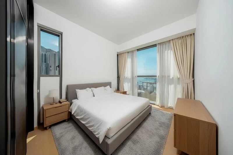 Step into a world of modern elegance as you enter this beautifully renovated unit at ONE BERNAM. The abundant natural light floods through the floor-to-ceiling windows, illuminating the marble-look flooring and enhancing the breathtaking views of the city skyline and sea. The minimalist ambiance is complemented by cove lighting, creating a serene and inviting atmosphere.