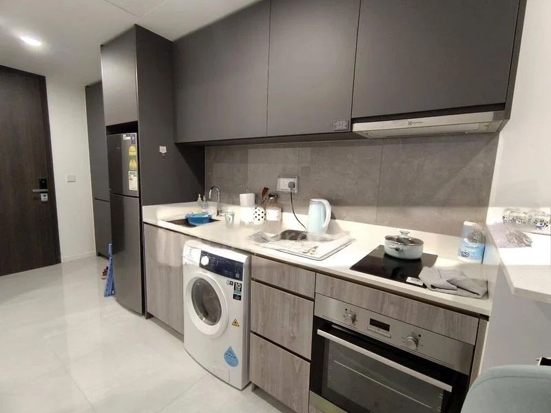 The efficient 59 sqm layout showcases standout features including a fully-equipped kitchen with an integrated refrigerator and induction hob, as well as a stylish bathroom complete with a rain shower and marble-patterned tiles. The master bedroom boasts large floor-to-ceiling windows, while the second bedroom offers a cozy retreat with wood-look laminate flooring. With ceiling fans and air conditioning throughout, comfort is guaranteed in every corner of this home.