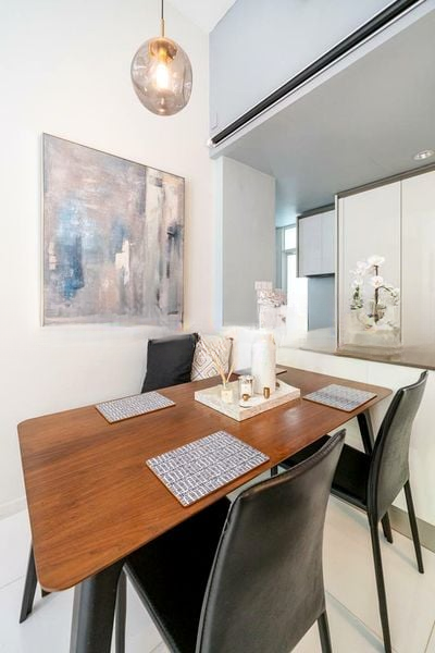 Step into a haven of modern minimalist design where abundant natural light floods every corner. The well-maintained unit at The Cascadia boasts stunning views of lush greenery, creating a serene ambiance that invites relaxation. The designer finishes, including a custom full-height TV console and elegant pendant lighting, elevate the living experience, making it a perfect retreat from the bustling city.