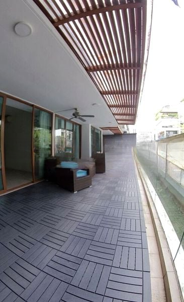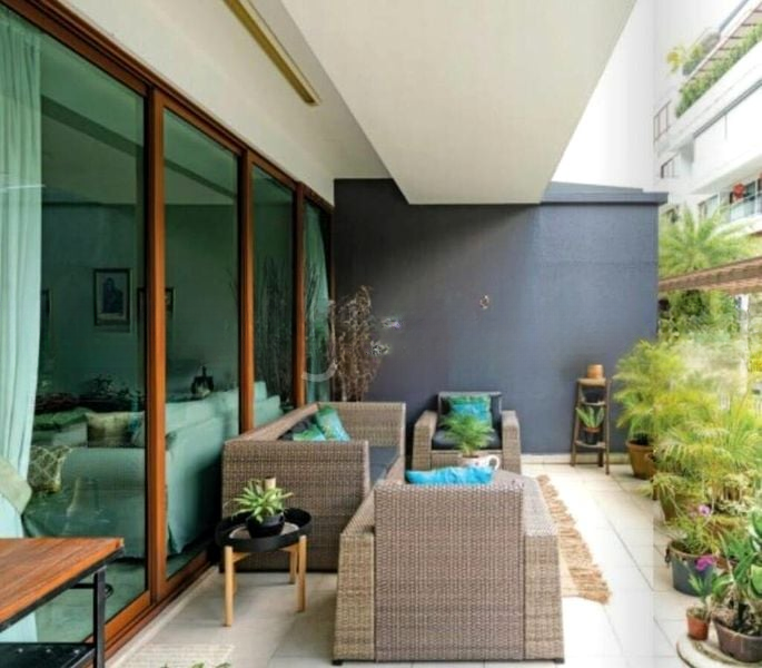 Step into this stunning 4-bedroom unit at Park Natura, where abundant natural light floods the open-concept living space, creating a bright and airy ambiance. The large balcony, adorned with grey interlocking deck tiles and a charming wooden trellis ceiling, offers serene views of lush greenery and neighboring buildings, perfect for relaxation or entertaining.