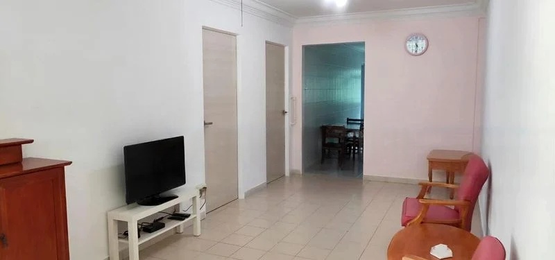 Step into this functional and spacious 3-bedroom flat, where abundant natural light floods through large window panels, creating a warm and inviting atmosphere. The open-concept living and dining area features a sleek black leather sofa and a glass coffee table, complemented by ceramic tiled flooring and ceiling fans that enhance the airy feel.