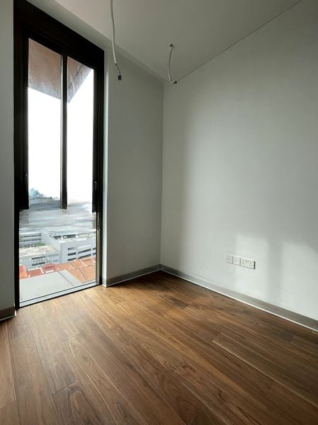 Step into a world of elegance as you enter this beautifully renovated unit at 8 HULLET. The open-concept living room greets you with warm wood-look flooring and an abundance of natural light filtering through floor-to-ceiling windows, offering captivating views of the city skyline and heritage shophouse roofs. The modern minimalist ambiance is enhanced by designer bouclé furniture and striking 3D wall art, creating a serene yet stylish living space.
