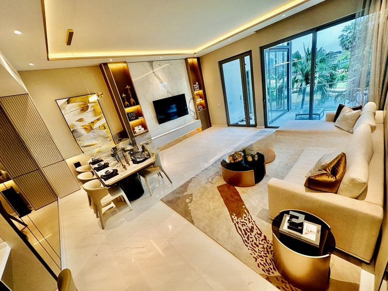 Step into a world of modern luxury as you enter this brand-new designer unit at The Residences at W Singapore Sentosa Cove. Bathed in natural light, the open-concept living area features a striking marble TV feature wall and floor-to-ceiling glass doors that frame breathtaking views of the waterway and lush greenery. The ambiance is elevated by designer pendant lighting and a spacious balcony perfect for enjoying serene sunsets over the marina.