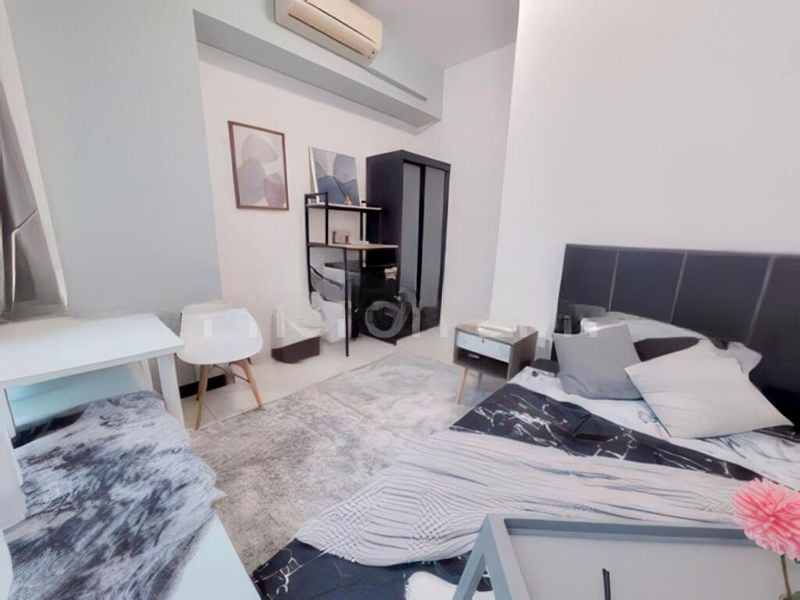 The thoughtfully designed layout features a spacious living room with recessed ceiling lights, an L-shaped sofa, and a dark wood TV console. The dining area boasts a dark wood dining set complemented by stylish pendant lighting, perfect for entertaining. The kitchen, separated by a sleek glass partition, is equipped with white cabinetry and dark countertops, offering both functionality and style. Retreat to the master bedroom, featuring a dark wood platform bed and purple curtains, ensuring a restful night’s sleep.