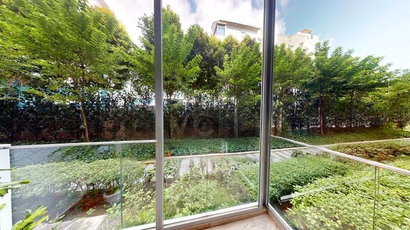 Step into a world of elegance and tranquility as you enter this stunning 2-bedroom unit at The Lilium. Bathed in natural light, the high ceilings and floor-to-ceiling windows create an airy ambiance, while the marble-look tile flooring and exquisite chandelier add a touch of luxury. Enjoy picturesque views of the lush landscaped garden from the living room, where a marble feature wall perfectly complements the white leather sofa.