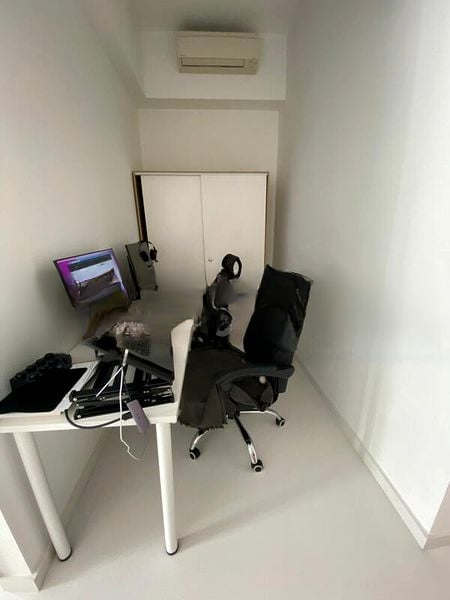 Step into this brand-new unit at THE QUINN and be captivated by the abundant natural light that floods the open-concept living area. The glossy white floor tiles reflect the modern minimalist design, while the striking red retro-style refrigerator adds a playful touch to the sleek kitchen. Enjoy urban views from your balcony, framed by teal louvered shutters that invite fresh air and a pop of color.