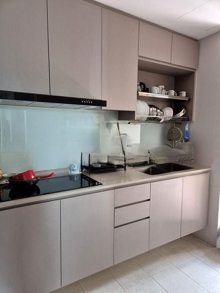 This well-maintained unit features a stylish kitchen with a terrazzo island countertop and open shelving, perfect for culinary enthusiasts. The master bedroom offers a tranquil retreat with a storage bed frame and large windows, while the second bedroom is ideal for work or study, equipped with a built-in storage bed and ergonomic desk. The bathrooms are a highlight, showcasing vessel sinks and a luxurious rain shower, all adorned with chic mosaic tiles.
